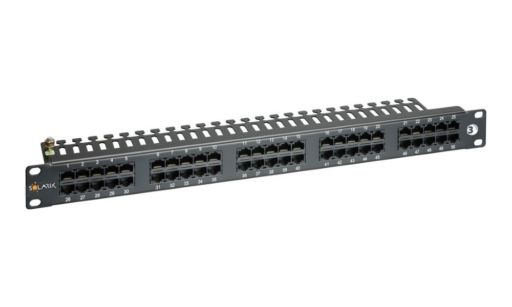Telefonní patch panel nabízí 50 portů a vývazovou lištu.