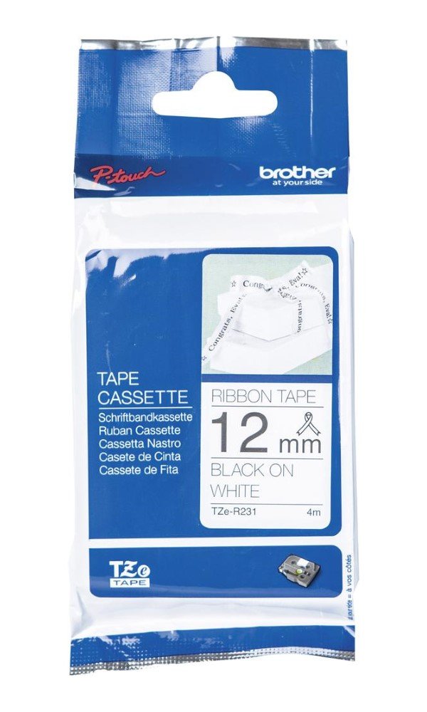 Brother TZE-R231 čená-bílá 12 mm TZ-R231 je textilní páska, která je vhodná pro individualizaci dárkových stuh. Může být také použita na výzdobu domova či při zvláštních příležitostech. ZÁKLADNÍ SPECIFIKACE Barva:... více