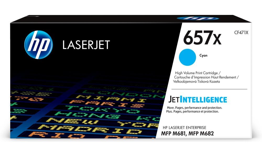 HP 657X (CF471X) azurový ZÁKLADNÍ SPECIFIKACE Pro tiskárny: HP Color LaserJet Enterprise M681dh, M681f, M681z Flow, M682z Flow Barva: azurová Výdrž: 23000 stran