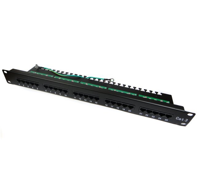 Telefonní patch panel 1U/19", 25x port Cat3, rozměry zadní desky 430 x 106 mm.