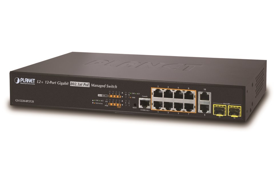 Plně gigabitový 10portový přepínač. Má 8 portů s napájením PoE a 2 porty metalické, dále dvě pozice pro instalaci SFP modulů s podporou diagnostiky DDM. Sdílené SFP (Small Factor Pluggable) sloty lze osadit libovolnými mini-GBIC kompatibilními s 1000Base-SX/LX, WDM SFP a 100Base-FX.