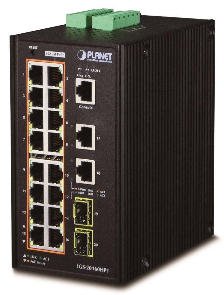 PoE průmyslový spravovatelný L2/L3 přepínač 18x 10/100/1000Base-T se 16 PoE injektory, 2x SFP 100/1000Base-X (SFP-DDM), 2x DI/DO; celkový napájecí výkon do 320 W.