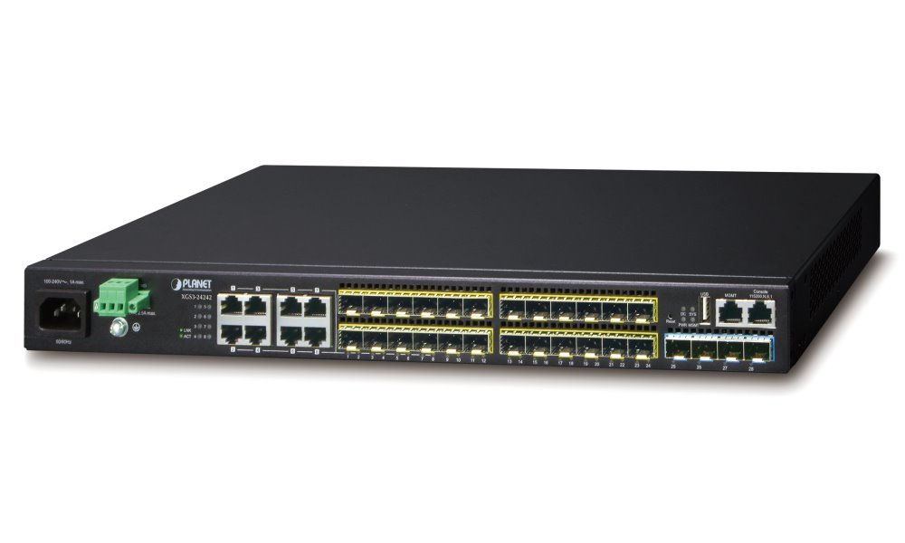 Stohovatelný spravovaný gigabitový přepínač na 3. vrstvě, který poskytuje vysoký výkon, statické směrování na 3. vrstvě, protokoly RIP (Routing Information Protocol) a OSPF (Open Shortest Path First) s 10 Gb/s uplinkem a několika optickými rozhraními SFP. Správce může flexibilně zvolit vhodný transceiver SFP/SFP+ podle požadované přenosové vzdálenosti nebo přenosové rychlosti. Kromě toho díky 128 Gb/s přepínací struktuře dokáže XGS3-24242 zpracovávat extrémně velké objemy dat v bezpečné/zajištěné topologii propojení s páteřními nebo vysokokapacitními servery pro ISP a podnikové aplikace VoIP, streamování videa a multicast.