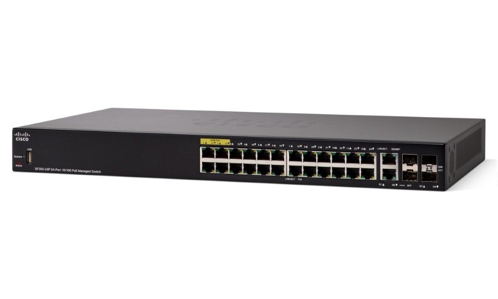 Počet portů: 24 x RJ-45, 2 x SFP, 2 x Gigabit Ethernet/SFP combo, 1 x USB pro správu