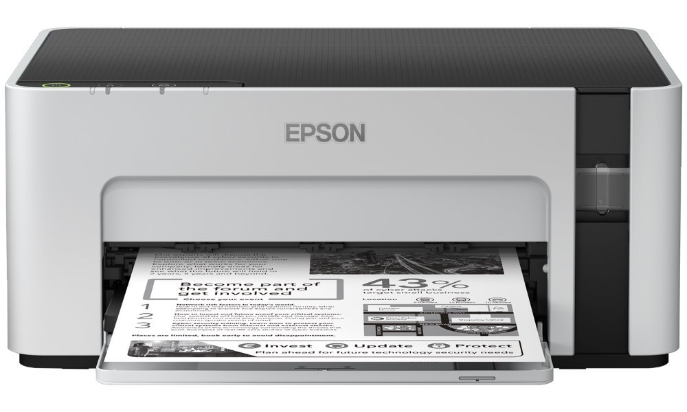 Inkoustová tiskárna Epson EcoTank M1100, která potěší uživatele především výrazně nízkými provozními náklady. Vzhledem k černobílému tisku a rychlosti až 15 stran za minutu se ideálně uplatní v kancelářské sféře a v rámci firemních pracovních procesů.