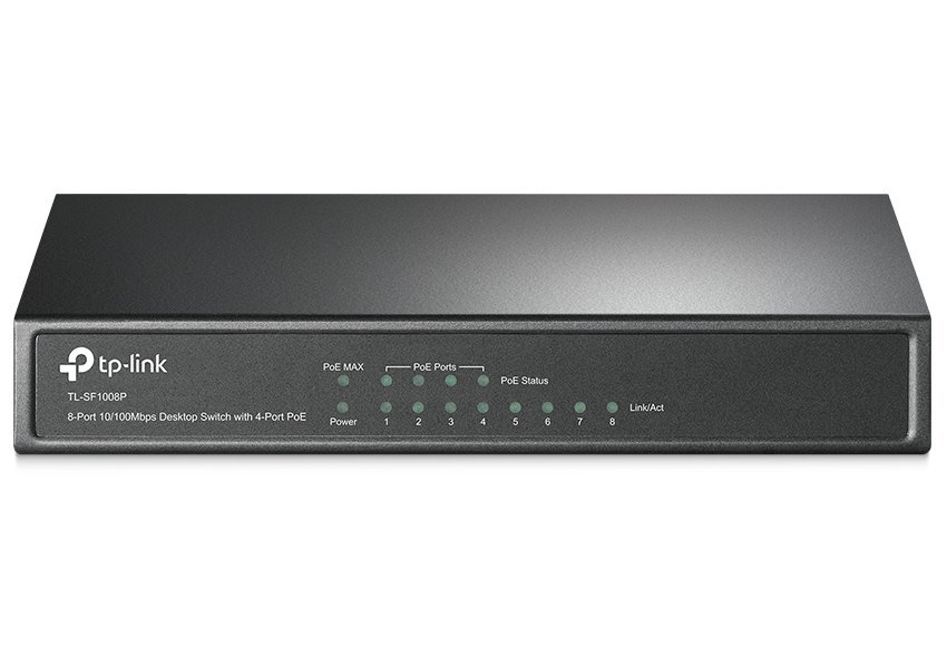 TL-SF1008P je 8portový 10/100Mbit/s neřízený switch, který nevyžaduje žádnou konfiguraci a poskytuje 4 PoE (napájení přes ethernet) porty s podporou normy 802.3af.