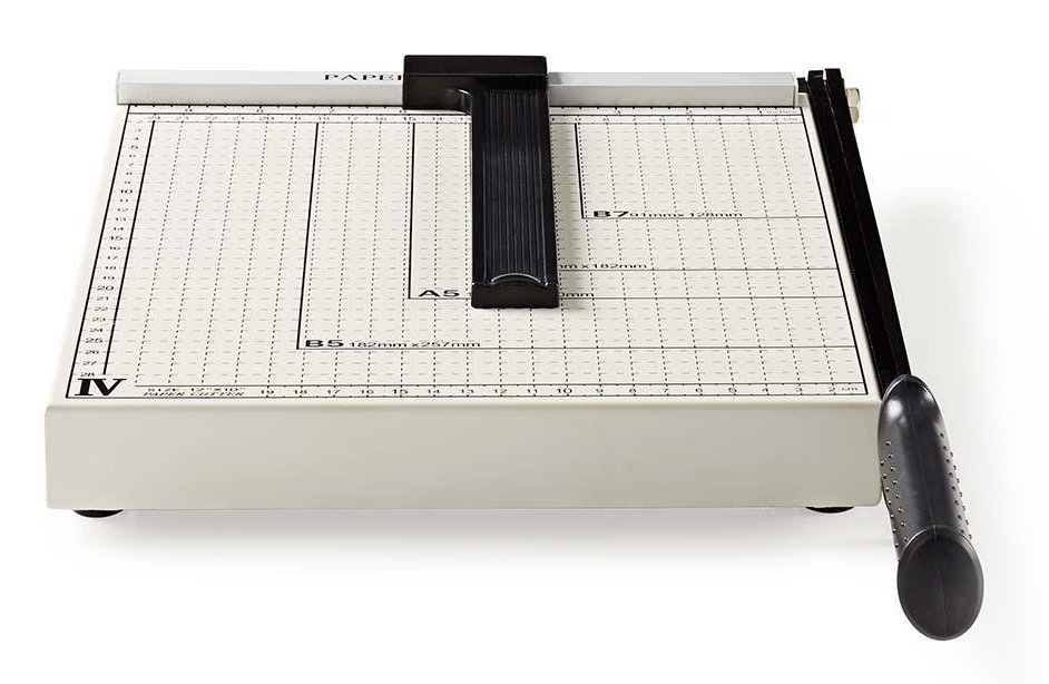 Řezačka papíru a fotopapíru formátu A4 s bezpečnostním zámkem. Deska o rozměrech 300 × 250 mm disponuje měřítkem v centimetrech i palcích a vyznačenými standardními velikostmi papíru.