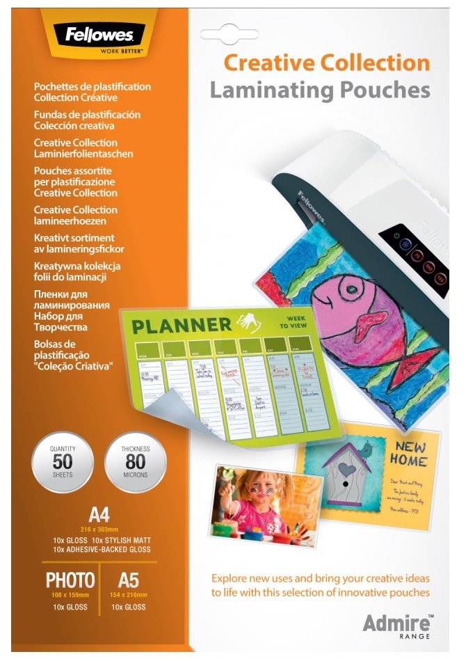 Balení obsahuje 10 ks A4 80 µm lesklé, 10 ks A4 80 µm matné, 10 ks A4 80 µm samolepící, 10 ks A5 80 µm lesklé a 10 ks 100 × 150 mm 80 µm lesklé fólie.