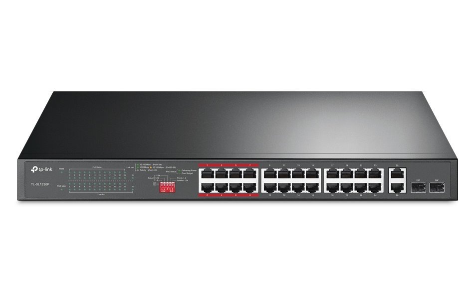 Switch nabízející 24x Fast Ethernet RJ-45 porty s podporou PoE+ a celkovým napájecím výkonem až 250 W. Dále nabízí dva GbE RJ-45 porty a dva Gbit SFP sloty. Přenos dat a napájení až do vzdálenosti 250 m v režimu "Extend Mode", který je speciálně navržený pro dohledový systém.
