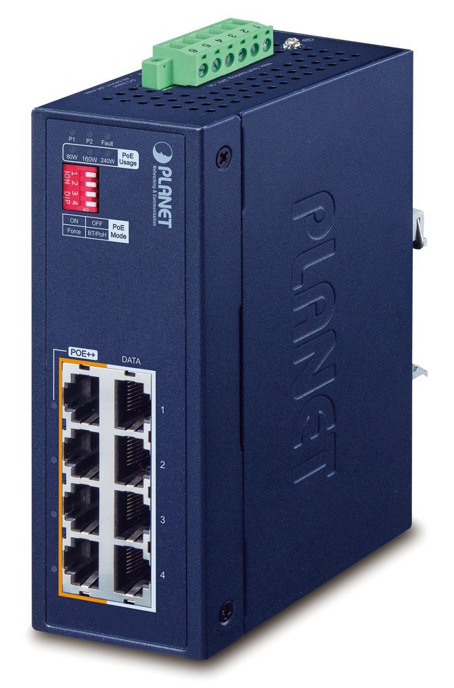Průmyslový "Power over Ethernet Injector" IEEE 802.3bt + PoH (Power over HDBaseT) s maximální zatížitelností 240 W pro napájení zařízení po Ethernetu. Designovaný pro použití s kamerami PTZ, dotykovými monitory, VoIP aparáty, POS (point of sale), kiosky, PoE osvětlení nebo Wi-Fi přístupovými body.