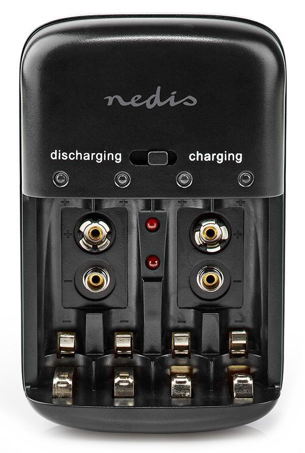Nabíječka až pro čtyři baterie typu AA nebo AAA, nebo až pro dvě baterie 9 V. Na nabíječce se nachází LED indikátor nabíjení.