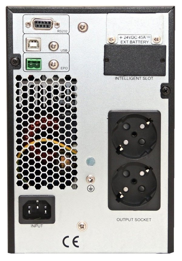 Online záložní zdroj se sinusovým výstupem a komunikačním rozhraním USB i RS-232. Na čelním panelu jsou k dispozici 3 ovládací tlačítka a informační displej.