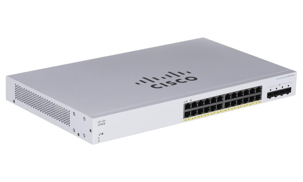 Porty: 24× GbE RJ-45, 4× SFP slot, 1× RJ-45 (konzole)