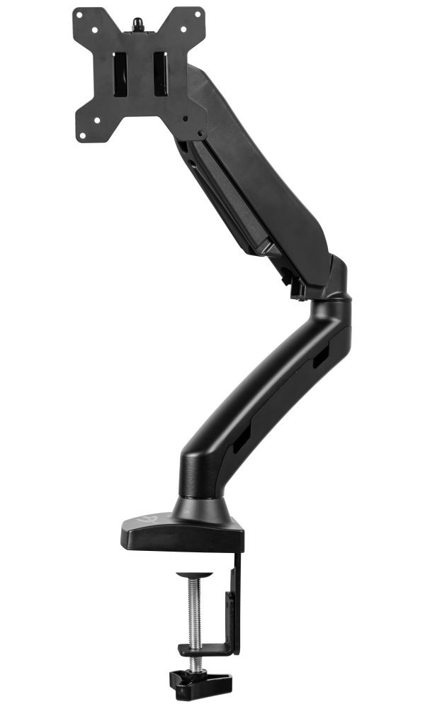Nastavitelný držák pro monitor ušetří místo na pracovním stole. Je vhodný pro ploché LCD monitory o velikosti 13" až 27" a hmotnosti do 7 kg. Disponuje plynovým pístem pro vyrovnání zátěže a umožňuje snadné nastavení optimální výšky, náklonu, horizontálního otočení i změnu orientace na výšku (Pivot 360°). Upevnění držáku je možné pomocí svorky na pracovní desku s tloušťkou až 82 mm. Intuitivní systém správy kabeláže minimalizuje nepořádek. Součástí balení je také šroub pro instalaci držáku do otvoru v desce stolu.