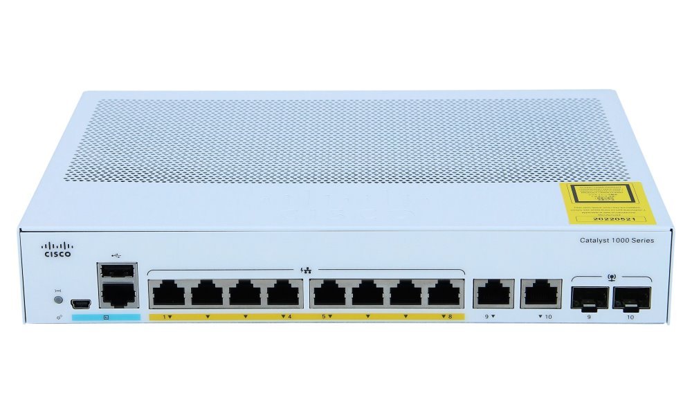 Počet portů: 8× GbE RJ-45 PoE+, 2× combo 1G SFP/RJ-45, 1× RJ-45 (konzole + management), 1× mini USB typ B (konzole), 1× USB 2.0
