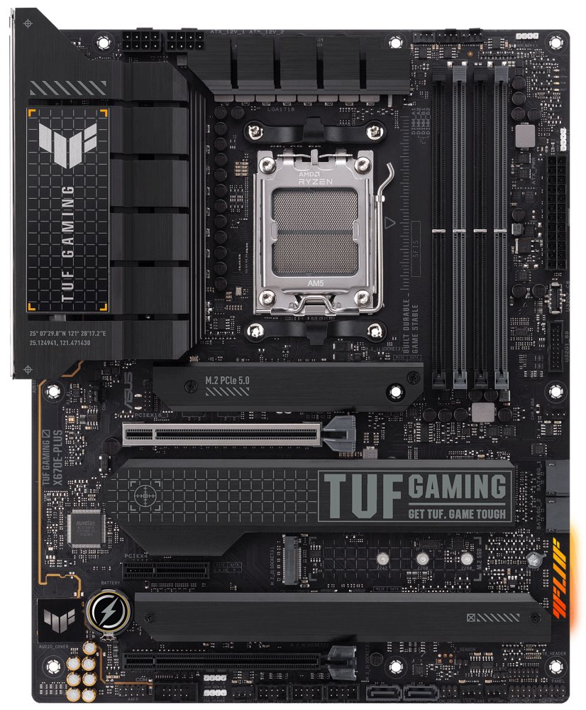 Základní deska ASUS TUF GAMING X670E-PLUS je navržena pro procesory AMD Ryzen série 7000 a využije bezezbytku jejich možnosti. Kombinuje totiž nejenom výkonnostní funkce, ale také mimořádně odolné komponenty, odpovídající vojenským standardům. Do herní řežby přichází také s vylepšeným systémem napájení a chlazením v čele s VRM chladiči, M.2 chladiči nebo podporou vodního čerpadla, aby odrazila i ten nejtěžší výpočetní nápor.