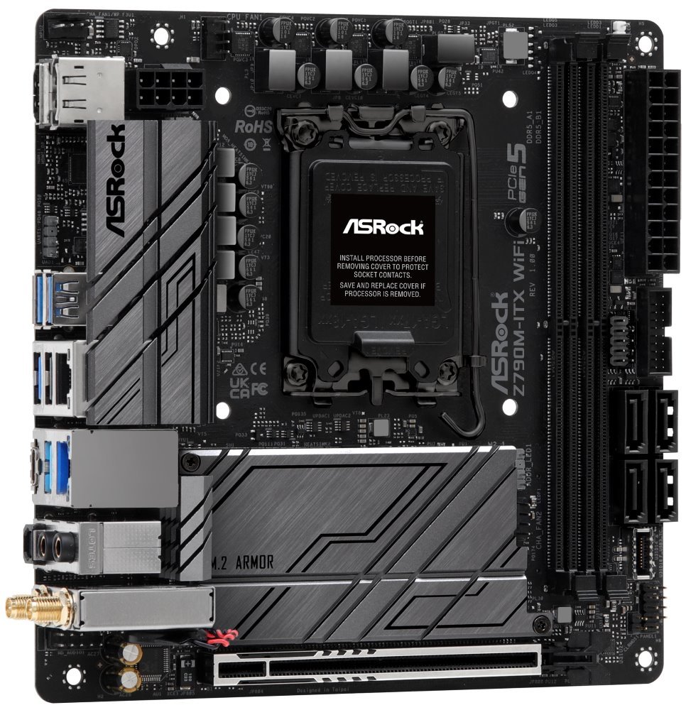 Základní deska ASRock Z790M-ITX WIFI, která svým návrhem utáhne výkon 12. a 13. generace procesorů Intel. Design Dr.MOS zajišťuje optimalizovaný přísun proudu a jeho monitoring pro přesné napájení a plynulý výkon procesoru. Dvojice paměťových slotů pojme až 64 GB pamětí typu DDR5. Rozhraní PCIe typu SMT zlepšuje signál a stabilitu při vysoké rychlosti.