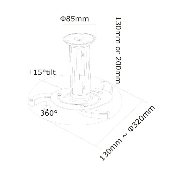 Ocelový stropní držák pro projektory. 360° otočná konstrukce, nastavitelná vzdálenost od stropu a funkce náklonu v rozsahu -15° až +15° umožňuje maximální flexibilitu zobrazení. Nosná ramena se hodí pro většinu projektorů se vzdáleností otvorů od 130 do 320 mm. Maximální zatížení tohoto držáku je 15 kg. Veškerý instalační materiál je součástí výrobku.