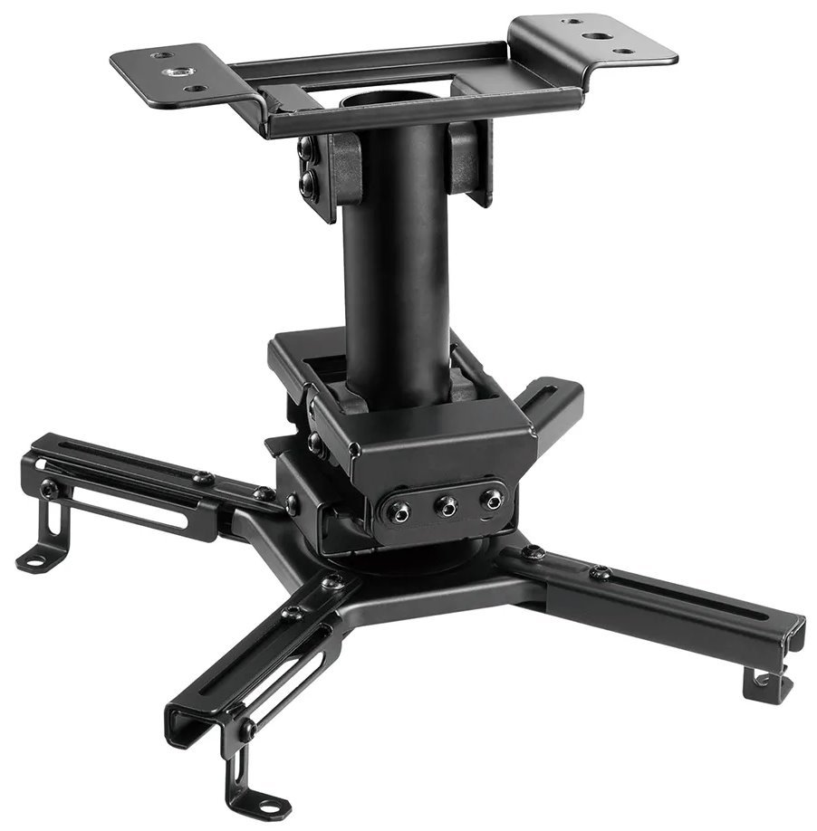 Ocelový stropní držák pro projektory. 360° otočná konstrukce, funkce náklonu o ±20° a natočení o ±8° umožňuje maximální flexibilitu zobrazení. Horní desku je navíc možné naklonit až o 90°, díky čemu lze držák umístit i na šikmý strop. Nosná ramena se hodí pro většinu projektorů se vzdáleností otvorů od 130 do 470 mm. Maximální zatížení tohoto držáku je 45 kg.