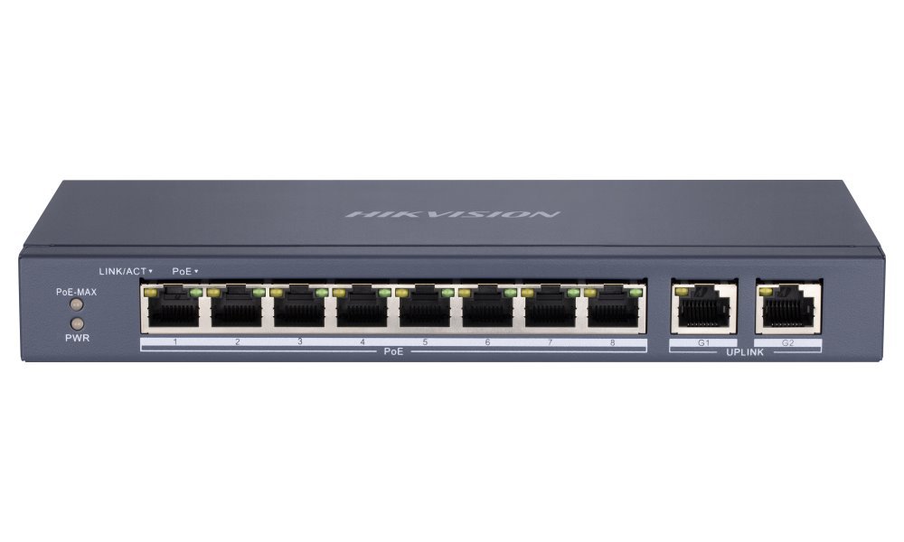 Hikvision DS-3E0310P-E/M Kompaktní nespravovaný (unmanaged) 10portový PoE switch pro napájení IP kamer či jiných zařízení s podporou PoE. Nabízí 8x PoE výstup 802.3af/at (max. 30 W/port) s celkovým výkonem až 60 W,... více