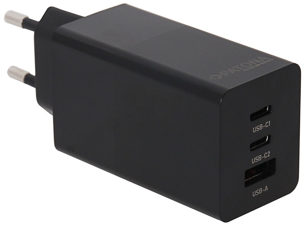 Napájecí adaptér PATONA s výkonem 65 W pro tablety a smartphony. Pro nabíjení zařízení je k dispozici konektor USB a dva konektory USB-C s podporou Power Delivery. Samozřejmostí je ochrana proti přehřátí a přepětí.