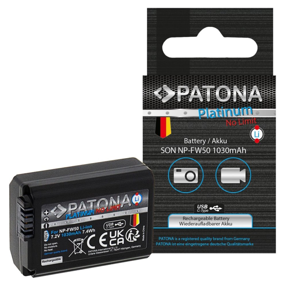 Kompatibilní baterie pro fotoaparáty Sony. Baterie se vyznačují vysokou kvalitou, mají integrovanou ochranu proti přetížení, přebití a přehřívání. Nabíjení baterie je realizováno skrze zabudovaný konektor USB-C. Lze ji nabíjet připojením kabelu do USB-C konektoru (např. z počítače, powerbanky či nabíječkou na mobilní telefon) tak i v klasické nabíječce na Li-ion. Nabíjecí proud max. 1,2 A (vyšší vstupní proudy jsou automaticky redukovány pomocí IC ovládání baterie).