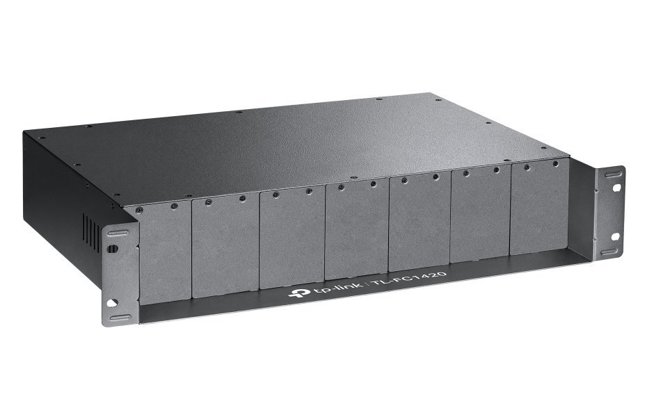 14slotové rackové šasi TL-FC1420 je speciálně určeno pro usazení 14 média konvertorů TP-Link pro zajištění centrálního napájení, čímž šetří místo a napájecí kabely.