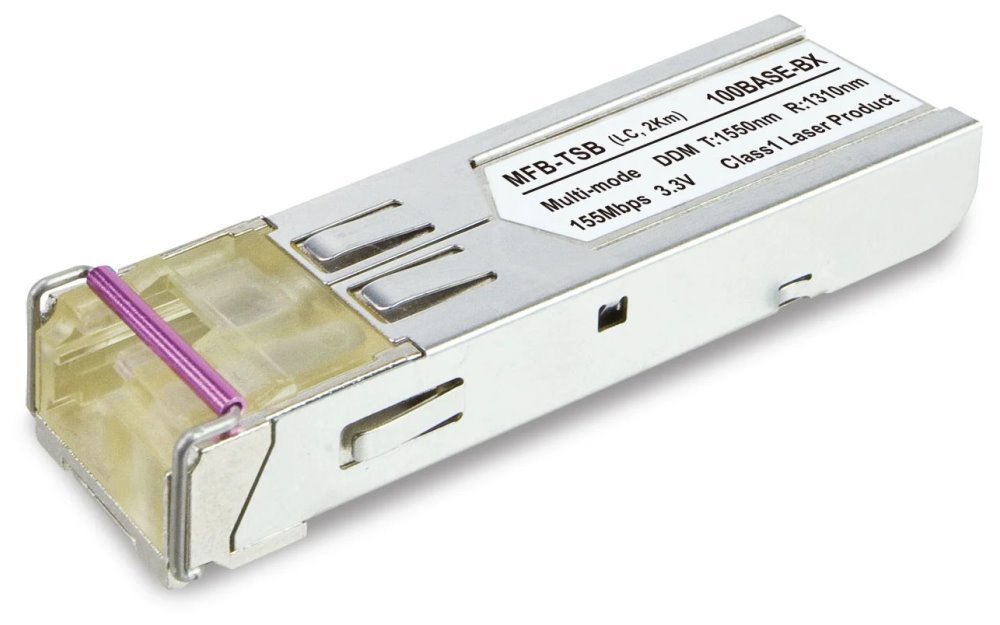 Fast Ethernetový modul formátu SFP, 100Base-FX, WDM (LC) konektor, multimode, vlnová délka TX: 1550 nm, RX: 1310 nm. Dosah spojení až 2 km. Podpora DDM.
