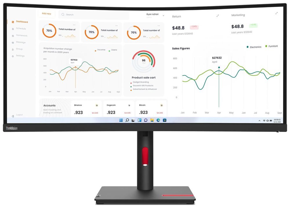 LED monitor Lenovo ThinkVision T34w-30 s prohnutým displejem, který je určen pro náročnou práci a multitasking. Na obří ploše 34" zobrazí rozsáhlé pracovní projekty, tabulky, dokumenty nebo aplikace ve více oknech najednou. Obrazovka nabízí vysoké rozlišení WQHD, díky čemuž produkuje ostrý obraz plný detailů. Zakřivený design podporuje přirozené zorné pole a umožní vám komfortní sledování po dlouhou dobu, v případě sledování multimédií vás rovněž vtáhne do centra dění.