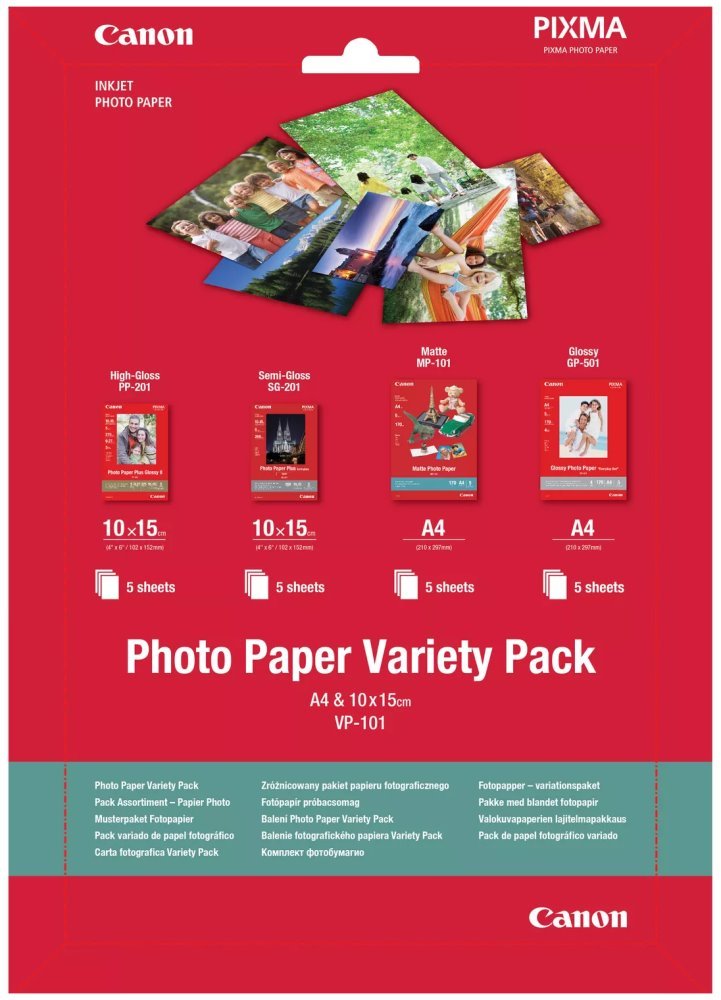 Canon VP-101 A4 + 10 × 15 cm Photo Paper Variety Pack obsahuje tři typy fotopapíru pro různé potřeby tisku. Každý druh papíru je optimalizován pro tisk na tiskárnách Canon a poskytuje kvalitní, rychleschnoucí fotografie s vynikající reprodukcí barev.