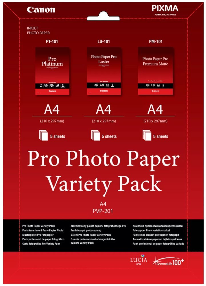 Canon Pro Variety Pack PVP-201 obsahuje tři typy fotopapíru pro různé potřeby tisku. Každý druh papíru je optimalizován pro tisk na tiskárnách Canon a poskytuje kvalitní, rychleschnoucí fotografie s vynikající reprodukcí barev.