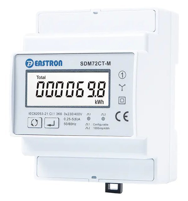 Třífázový elektroměr, který kromě měření činné energie (kWh) a výkonu (W) podporuje komunikaci přes RS-485 RTU Modbus, což umožňuje snadnou integraci do monitorovacích a řídicích systémů. Krytí IP51 poskytuje ochranu proti prachu a vodě, což zajišťuje spolehlivost v náročných podmínkách. Dále je vybaven pulsními výstupy pro měření spotřebované energie, které umožňují snadné monitorování a zaznamenávání dat externími zařízeními. Navíc podporuje obousměrné měření, což znamená, že dokáže zaznamenávat jak energii odebíranou ze sítě, tak i energii vracenou zpět do sítě.