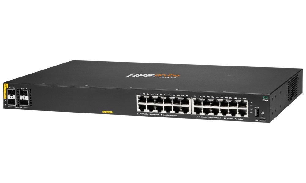 HPE Aruba Networking CX 6100 je moderní řada switchů základní úrovně, která je ideální pro pobočky, malé a střední podniky. Tato řada, navržená pro spolehlivý, jednoduchý a bezpečný přístup, poskytuje pohodlné řešení pro podnikové sítě podporující IoT, mobilní a cloudové aplikace.