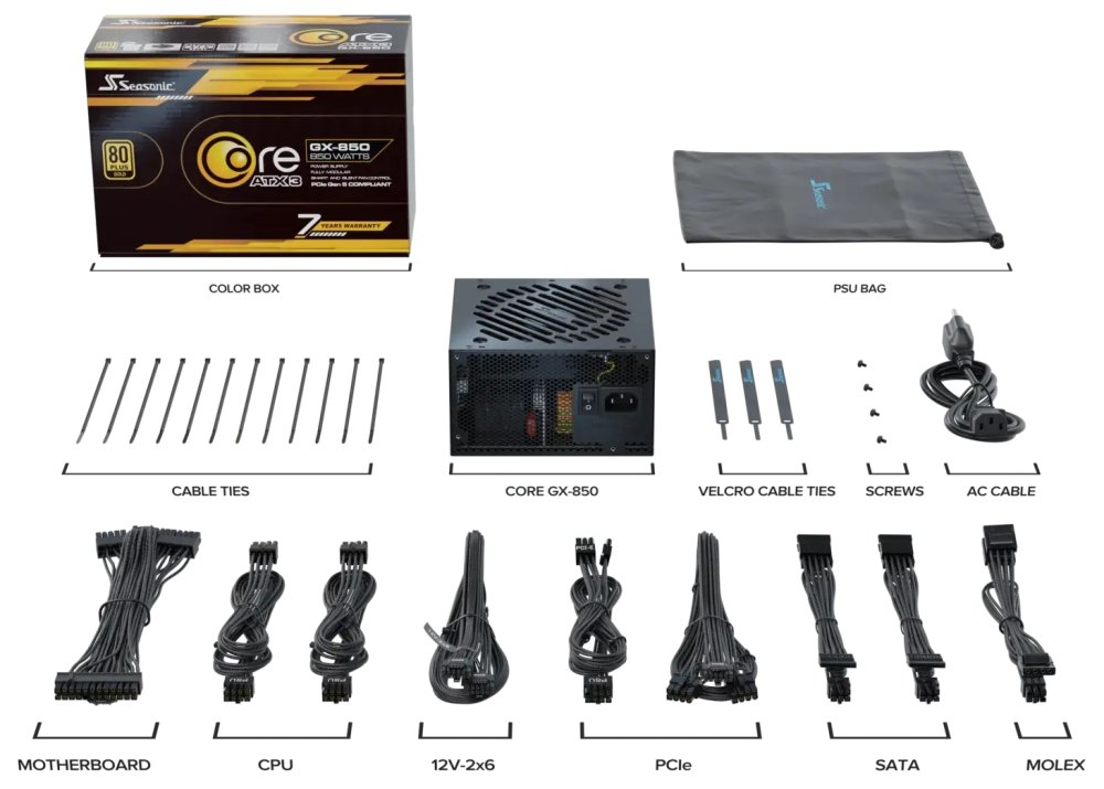 Napájecí zdroj Seasonic Core GX-850 splňuje nejnovější standardy ATX 3.1 a PCIe 5.1 a díky modulární konstrukci je ideální pro široké spektrum PC systémů. Součástí zdroje je rovněž 120mm ventilátor s dynamickými Hydro ložisky, který zajišťuje optimální chladicí výkon při zachování nízké hladiny hluku. Modelová řada CORE GXATX se vyznačuje lepším uspořádáním PCB (Printed Circuit Board) a celkovou konstrukcí. Vylepšená deska plošných spojů s menšími MOSFETy přispívá k optimálnímu odvodu tepla, proudění vzduchu a chlazení komponent uvnitř.