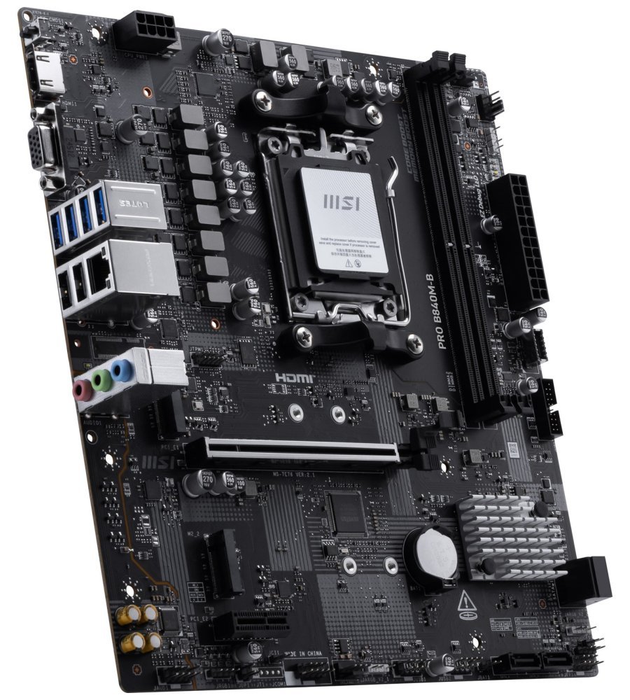Základní deska MSI PRO B840M-B je navržena pro stavbu moderních PC systémů založených na výkonných procesorech AMD Ryzen. Tento model podporuje procesory AMD Ryzen série 7000, 8000 a 9000, díky čemuž je vhodná pro náročnou pracovní činnost i multimediální zábavu. Pro operační paměť je k dispozici dvojice slotů s maximální kapacitou 64 GB. Operační paměť typu DDR5 podpoří plynulou odezvu při práci s více aplikacemi.