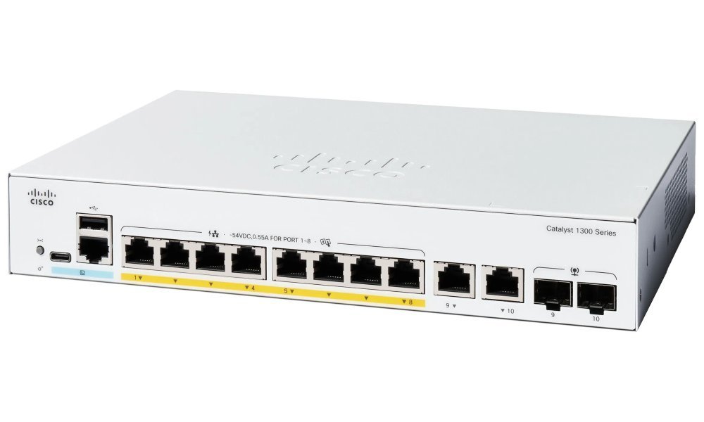 Cisco Catalyst 1300 Series je řada přepínačů navržených pro firemní pobočky a sítě malých a středních podniků. Tento model nabízí 8 gigabitových portů s podporou PoE+ a 2 kombinované gigabitové porty (RJ-45/SFP) pro flexibilní připojení k páteřní síti. S celkovým PoE rozpočtem 67 W umožňuje napájet připojená zařízení jako IP telefony, bezdrátové přístupové body nebo IP kamery.