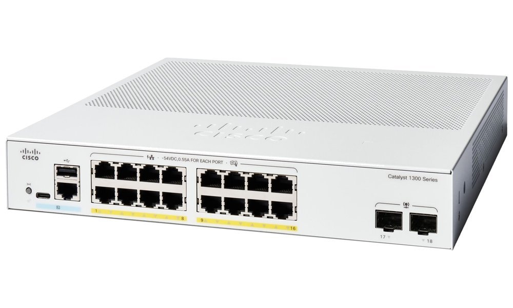 Počet portů: 16× RJ-45 10/100/1000 Mb/s PoE+, 2× 1G SFP slot, 1× RJ-45 (konzole), 1× USB-C (konzole), 1× USB 2.0