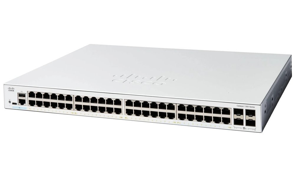 Počet portů: 48× RJ-45 10/100/1000 Mb/s, 4× 10G SFP+ slot, 1× RJ-45 (konzole), 1× USB-C (konzole), 1× USB 2.0