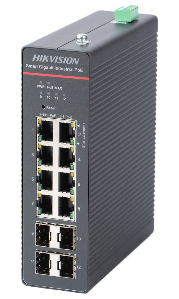 Průmyslový spravovatelný 12portový PoE switch pro napájení IP kamer či jiných zařízení s podporou PoE. Nabízí PoE výstup 4× 802.3af/at (max. 30 W/port) a 4× 802.3bt (max. 90 W/port) s celkovým výkonem až 300 W, přepěťovou ochranu do 6 kV a kapacitu 56 Gbps. Switch navíc disponuje extend módem pro přenos dat a napájení až na 300 m při 10 Mb/s (dle kvality kabeláže).