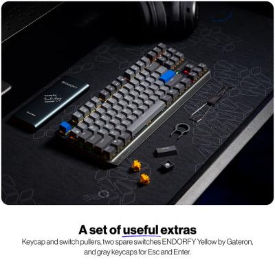 Klávesnice je dodávána s 2,4GHz USB donglem, nástroji na sejmutí kláves a spínačů, dvěma náhradními spínači Endorfy Yellow a minimalistickými šedými klávesami Esc a Enter pro personalizaci vzhledu.