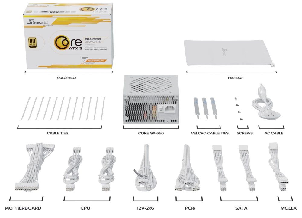 Napájecí zdroj Seasonic Core GX-650, který s přehledem zvládne náročné pracovní sestavy nebo herní PC s výkonnými grafickými kartami. Dosahuje výkonu 650 W a podporuje nejnovější standardy ATX 3.1 a PCIe 5.1. Díky tomu je vhodný zejména do sestav, které jsou osazeny moderními komponenty. Zdroj Seasonic Core GX-650 dále splňuje certifikaci 80 PLUS Gold, což znamená, že nabízí vysoký výkon a stabilitu při zachování nízké ztráty energie a míry zahřívání.