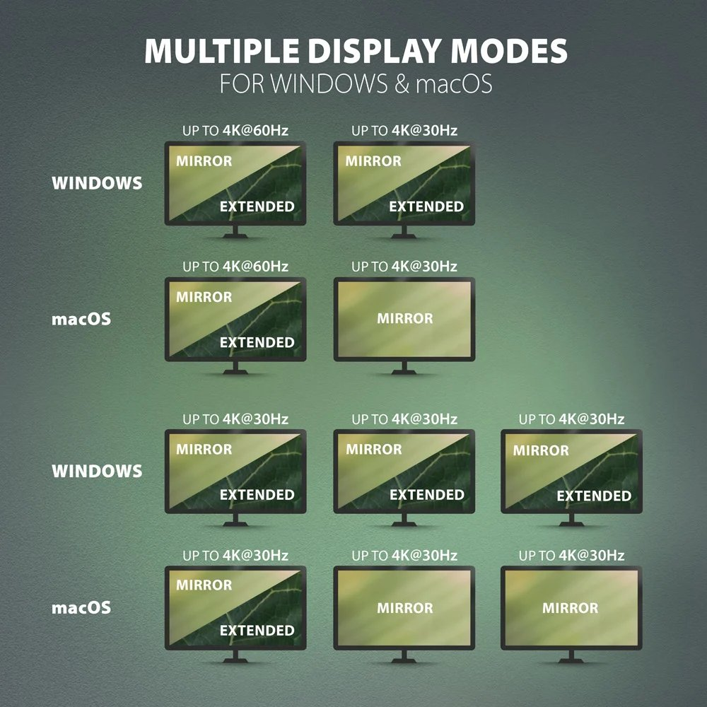 Pro správné fungování video výstupu je nutné, aby USB-C port notebooku podporoval DisplayPort Alternate Mode (DP Alt Mode) nebo Thunderbolt 3/4. Podpora maximálních rozlišení a frekvencí vyžaduje připojení k počítači s DisplayPort verze 1.4. Hub podporuje různé zobrazovací režimy včetně zrcadlení a rozšíření plochy primárního monitoru.