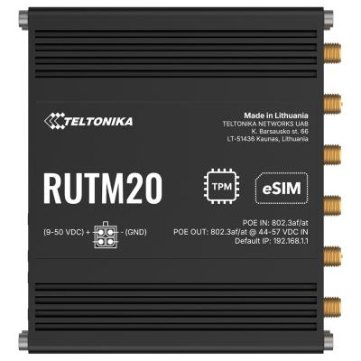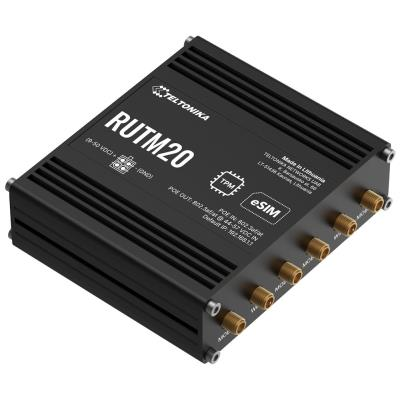 RUTM20 je ultra-kompaktní průmyslový 5G router navržený pro IoT a IIoT řešení, kde záleží na velikosti a nákladech. Využívá globální Telit 5G modem podporující 5G Sub-6GHz SA/NSA s rychlostmi až 2,5/3,4 Gbps DL (4×4 MIMO) a 900/550 Mbps UL (2×2), LTE Cat 19 (1,6 Gbps DL) a 3G (42 Mbps DL). Router je vybaven 2× fyzickými SIM sloty (Mini SIM 2FF) a 1× eSIM s podporou až 7 profilů, což umožňuje vzdálené přepínání operátorů bez nutnosti fyzického zásahu.