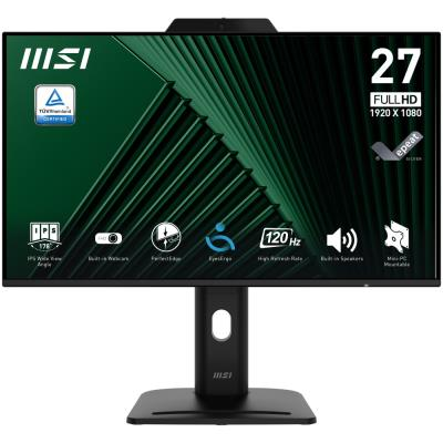 Monitor MSI PRO MP272PMG je určen pro moderní kancelářské prostředí a kombinuje 27" IPS panel s rozlišením Full HD (1920 × 1080 px), vysokou obnovovací frekvenci 120 Hz a rychlou dobu odezvy 1 ms (MPRT). Díky integrované Full HD webkameře (1080p) s digitálním mikrofonem a fyzickou krytkou je ideální pro videokonference a online komunikaci.