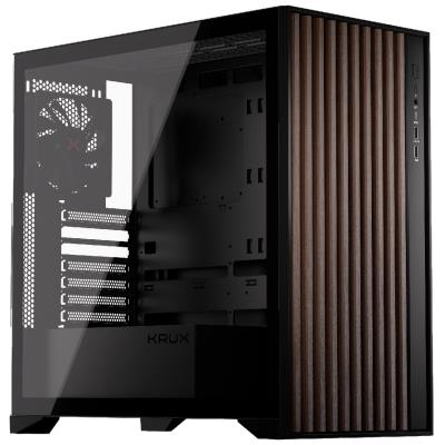 Krux Palum kombinuje moderní design s praktičností. Přední panel s tmavými dřevěnými prvky dodává skříni unikátní vzhled, který se hodí do kanceláře i obývacího pokoje. Boční panel z temperovaného skla s bezšroubovým montážním systémem umožňuje rychlý přístup k vnitřním komponentám a jejich snadnou prezentaci.