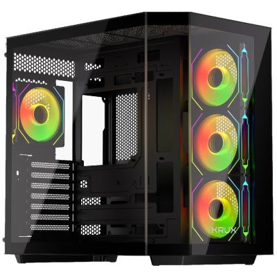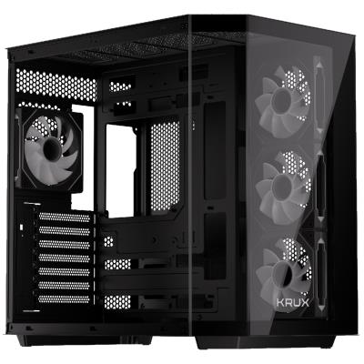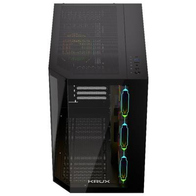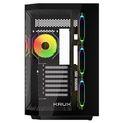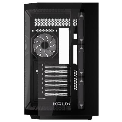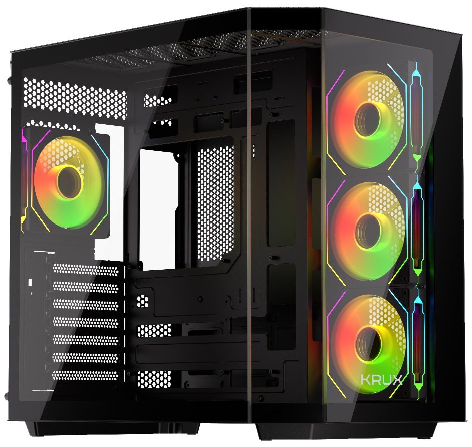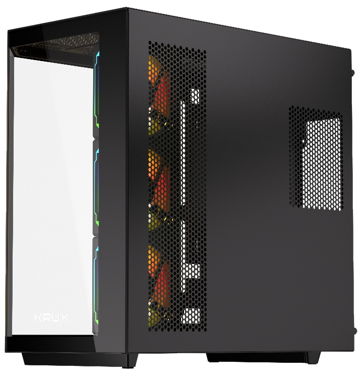 Skříň nabízí dual-chamber konstrukci s unikátním umístěním zdroje v dedikované komoře za základní deskou, což vytváří čistý a atraktivní vzhled sestavy. Součástí balení jsou čtyři Krux 120 mm ARGB PWM ventilátory s regulací otáček a PWM splitter s ARGB kontrolerem pro snadné ovládání až 6 ventilátorů bez nutnosti připojení každého zvlášť k základní desce.