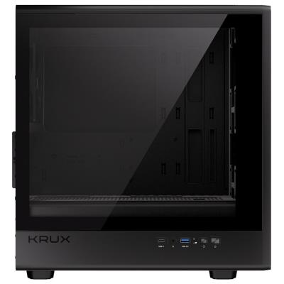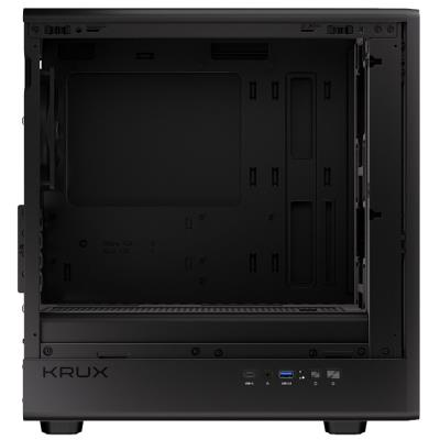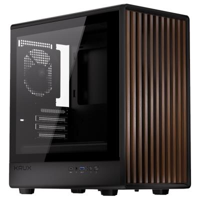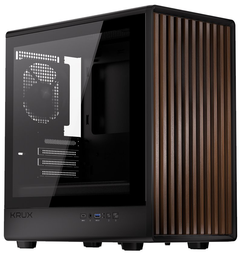 Obudova Krux Helio kombinuje elegantní design s praktickými funkcemi pro sestavy ve formátu microATX a Mini-ITX. Minimalistický přední panel s tmavými dřevěnými lištami a zaoblenými hranami vytváří nadčasový vzhled vhodný do kanceláře i herního pokoje. Boční panel z hartovaného skla umožňuje pohled na komponenty a zdůrazňuje moderní charakter sestavy.