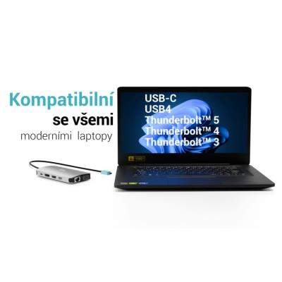 Dokovací stanice je kompatibilní se zařízeními s portem USB-C, USB4 nebo Thunderbolt™ 3/4/5. Pro funkci video výstupu je vyžadován port s podporou alternativního režimu DisplayPort nebo Thunderbolt™ 3/4/5. Pro Power Delivery je nutná podpora této funkce na straně připojeného zařízení.