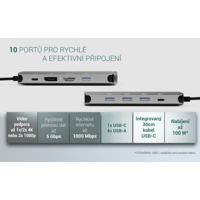Kompaktní dokovací stanice rozšíří váš notebook nebo tablet o širokou škálu portů včetně podpory až tří externích monitorů. Stačí ji připojit pomocí integrovaného USB-C kabelu (30 cm) a okamžitě získáte přístup k vysokorychlostním USB portům, gigabitové síti i vícemonitorovému pracovnímu prostředí – bez nutnosti instalace ovladačů (Plug & Play).