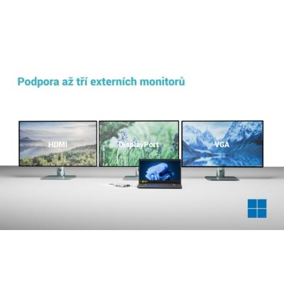 Dokovací stanice nabízí kombinaci HDMI 2.0, DisplayPort 1.2 a VGA, díky čemuž snadno připojíte moderní i starší monitory. Podporuje rozlišení až 4K/60 Hz při připojení jednoho monitoru, případně více monitorů současně (až 3× 1080p/60 Hz). Technologie USB-C MST (Multi Stream Transport) umožňuje efektivní správu více displejů. Tělo z kvalitního hliníku zajišťuje dostatečnou odolnost při každodenním používání i na cestách.
